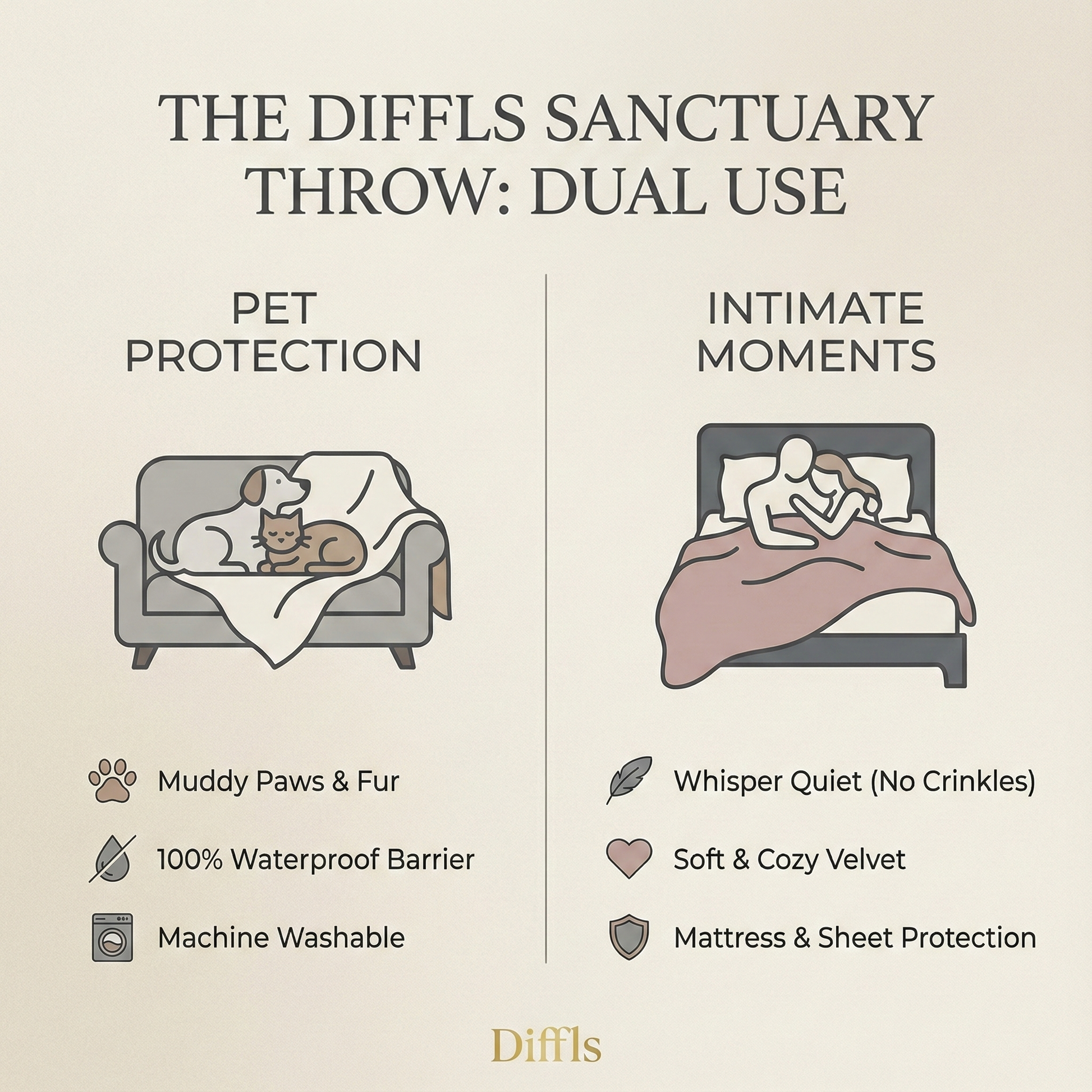 Life happens. Your furniture shouldn't have to pay the price. The Diffls™ Sanctuary Throw is the world's first blanket that blends 100% waterproof utility with premium home decor aesthetics.